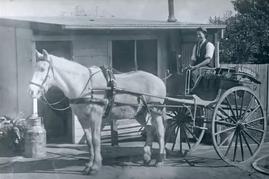 Believed to be image of Sydney George Alfred Peake driving the cart of A Dunbar, butcher or baker, c. 1908. Possibly in front of 710 Forest Road Penshurst.